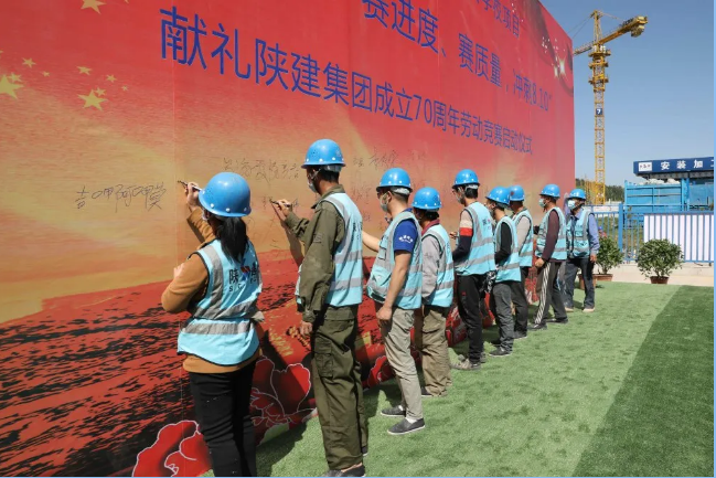 啟動(dòng)儀式上,公司生產(chǎn)管理部副部長(zhǎng)路潔宣讀了《勞動(dòng)競(jìng)賽實(shí)施方案》,明確此次勞動(dòng)競(jìng)賽旨在加快施工進(jìn)度,提高生產(chǎn)效率,提高工程質(zhì)量、確保安全生產(chǎn),保證8月10日交付使用。施工單位、勞務(wù)公司代表分別作表態(tài)發(fā)言。他們表示將會(huì)以實(shí)際行動(dòng)推進(jìn)項(xiàng)目建設(shè),不辱使命、全力以赴,奮力完成各項(xiàng)任務(wù)目標(biāo),為陜建集團(tuán)成立70周年獻(xiàn)禮。隨后,全體人員在勞動(dòng)競(jìng)賽背景墻簽字承諾。
