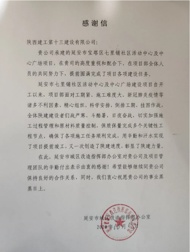 在繼南川河防洪工程、延安大學(xué)新校區(qū)體育中心項(xiàng)目之后,10月15日,公司負(fù)責(zé)施工的延安市七里鋪社區(qū)活動(dòng)中心及中心廣場(chǎng)項(xiàng)目收到了來(lái)自建設(shè)單位的感謝信。延安市城區(qū)改造指揮部在感謝信中提到:陜建十三建公司延安寶塔區(qū)七里鋪社區(qū)活動(dòng)中心及中心廣場(chǎng)項(xiàng)目全體建設(shè)者戰(zhàn)嚴(yán)寒、斗酷暑,日夜奮戰(zhàn),切實(shí)加強(qiáng)施工過(guò)程管理和質(zhì)量控制,保質(zhì)保量完成了多個(gè)關(guān)鍵性工程節(jié)點(diǎn),確保了各項(xiàng)施工任務(wù)順利完成,用辛勤和汗水實(shí)現(xiàn)了項(xiàng)目提前竣工,又一次創(chuàng)造了陜建速度,彰顯了陜建力量。